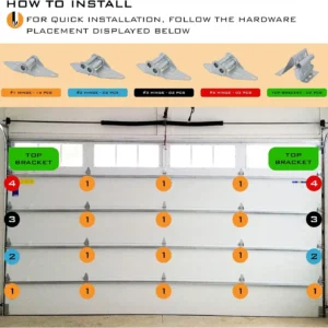 TUNE UP KIT – For 8′ garage doors, the kit includes 14 #1 Hinges, 2 #2 Hinges, 2 #3 Hinges, 2 #4 Hinges, 2 Top Brackets, 12 sealed cap bearing nylon rollers, cable, and mounting screw hardware.